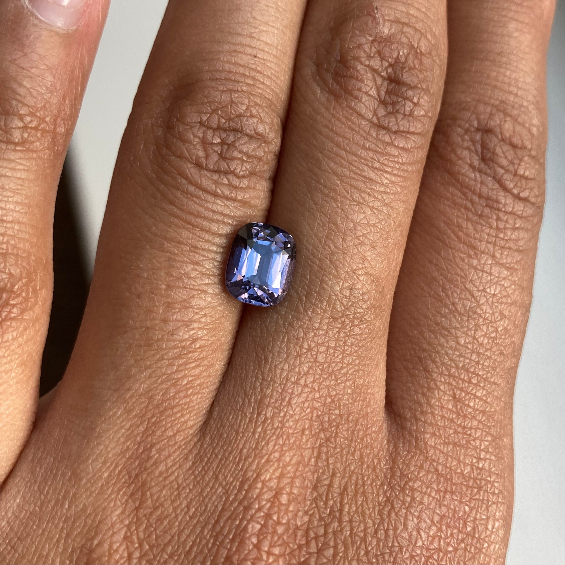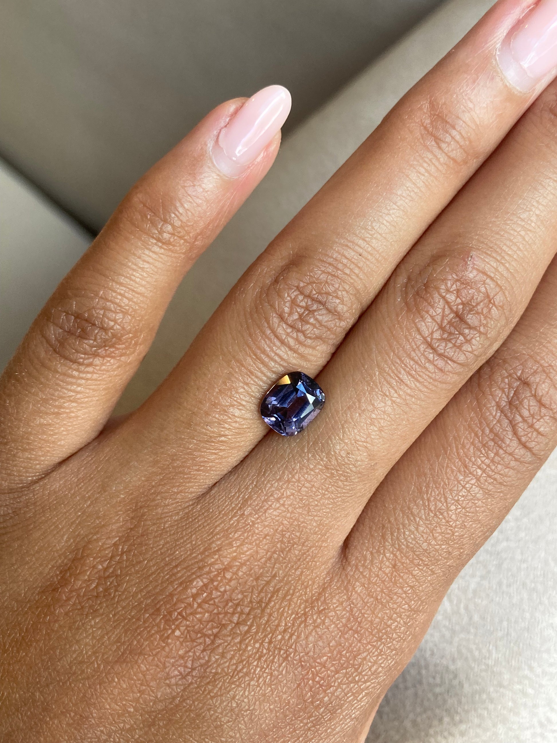 This steely-violet spinel is effortlessly cool and has a neutral tone that would be just as beautiful in rose and yellow gold as it would in platinum.