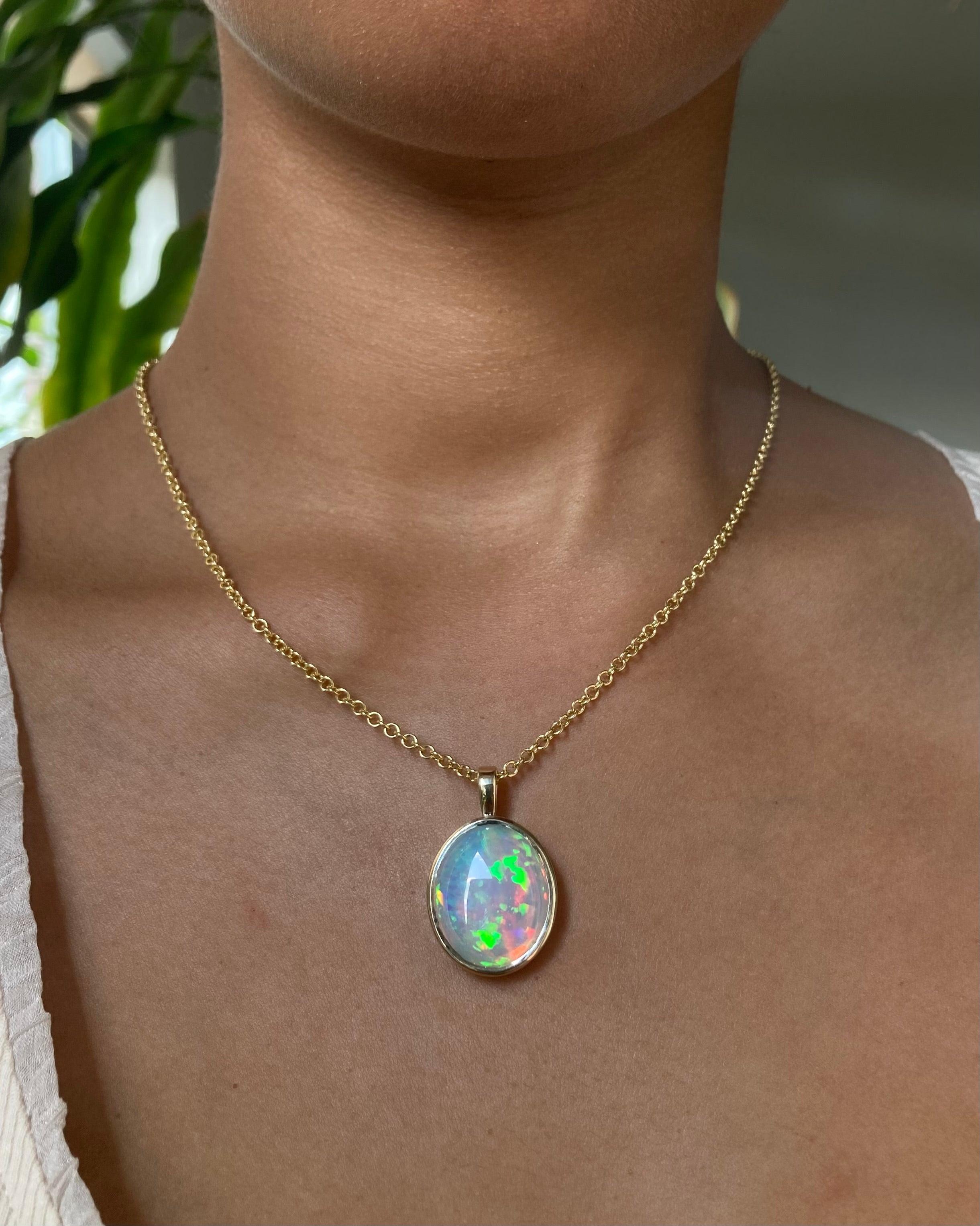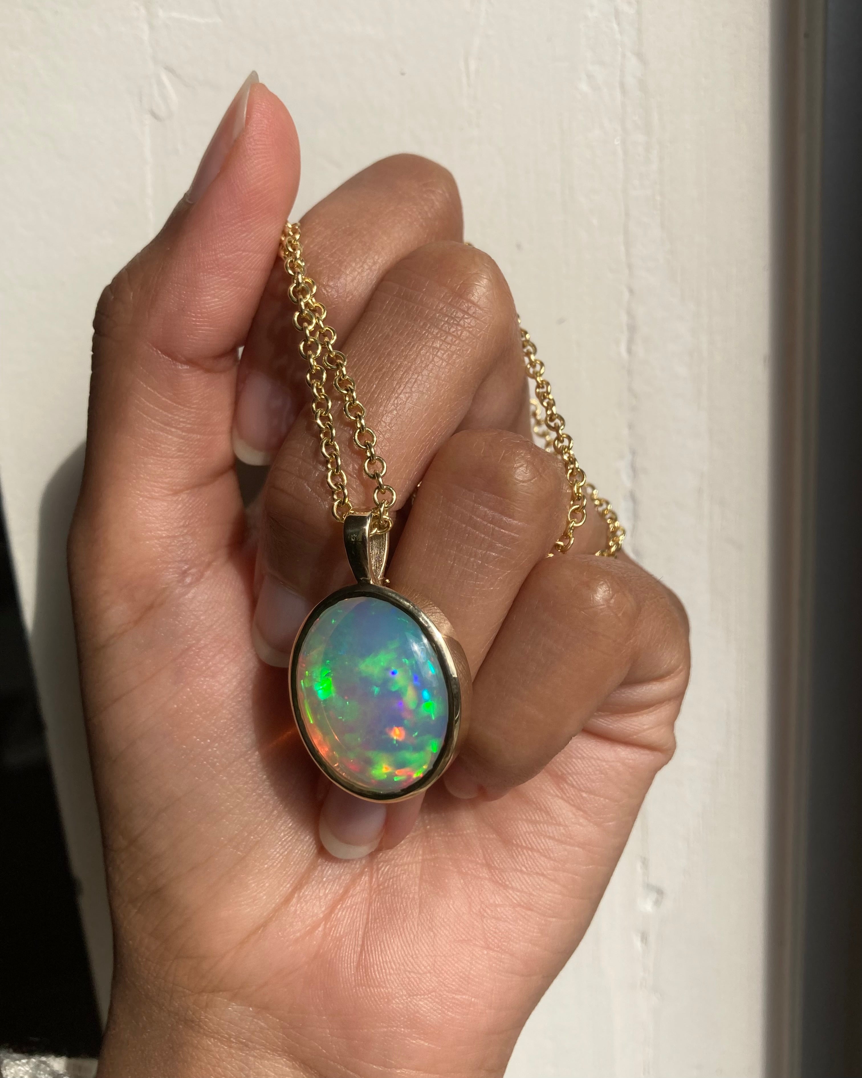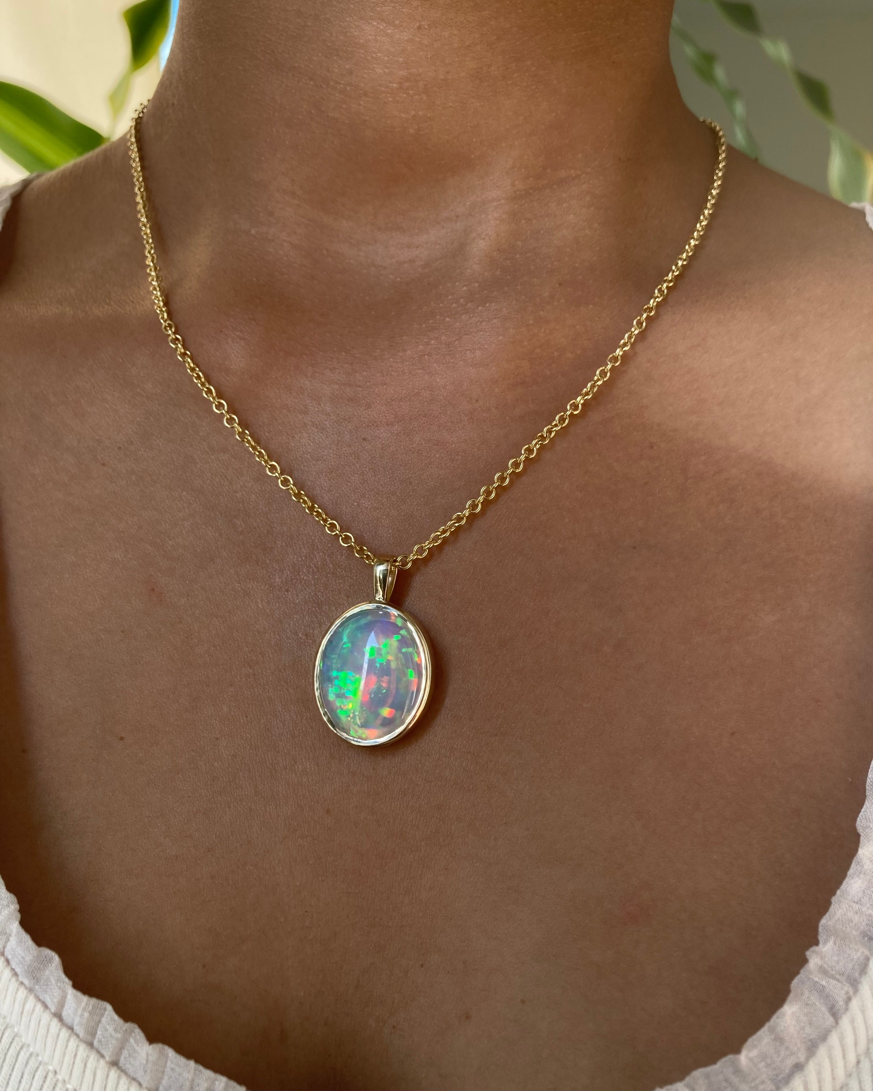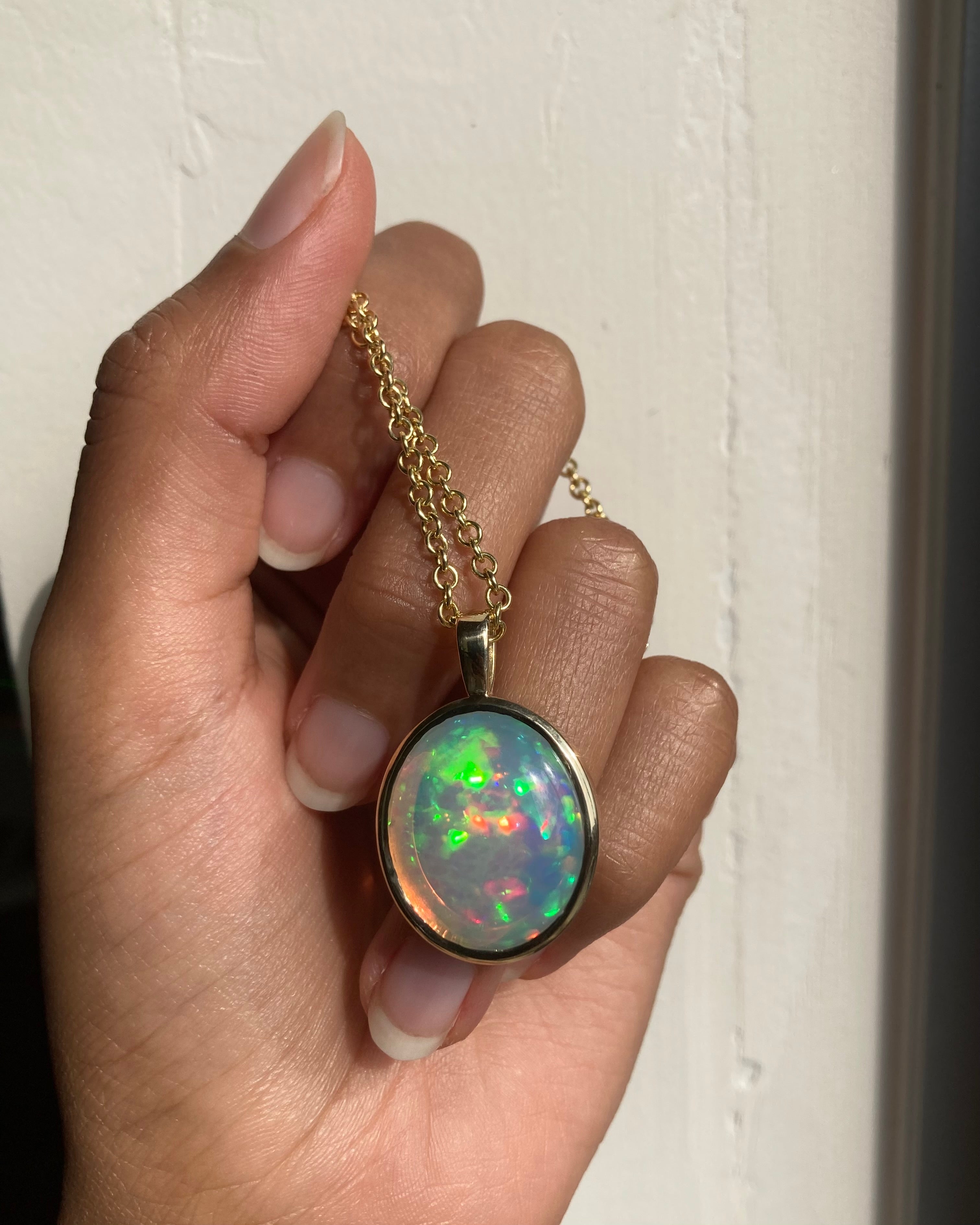 A crystal clear opal with spectacular fire. Neon shades of green and red dance across this stone. A true stunner with lots of play of color. Hand-set in our signature thick bezel, finished with a beveled edge.