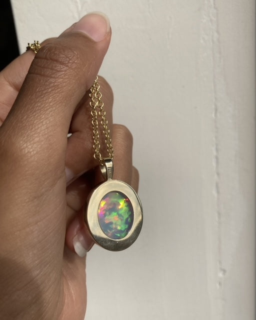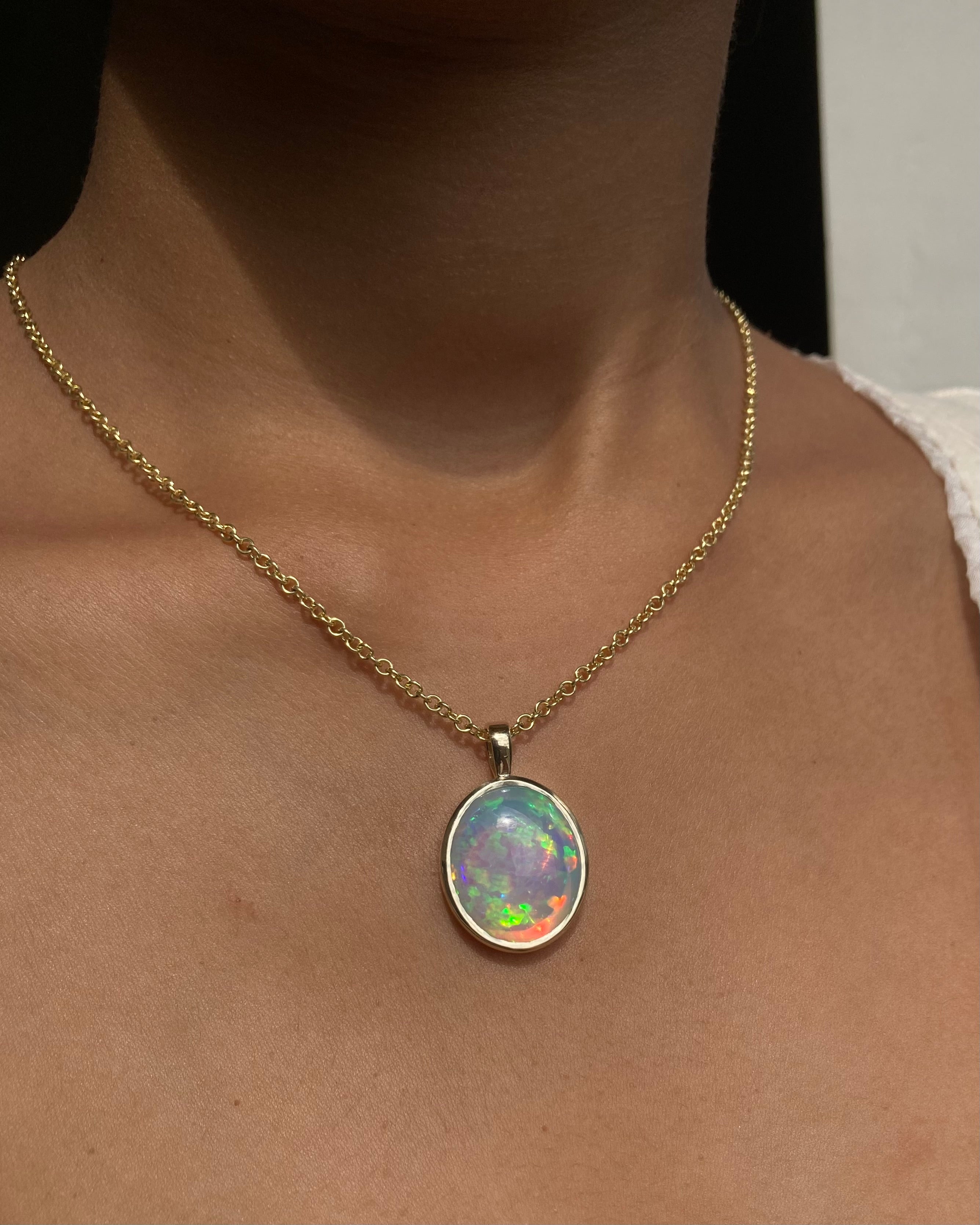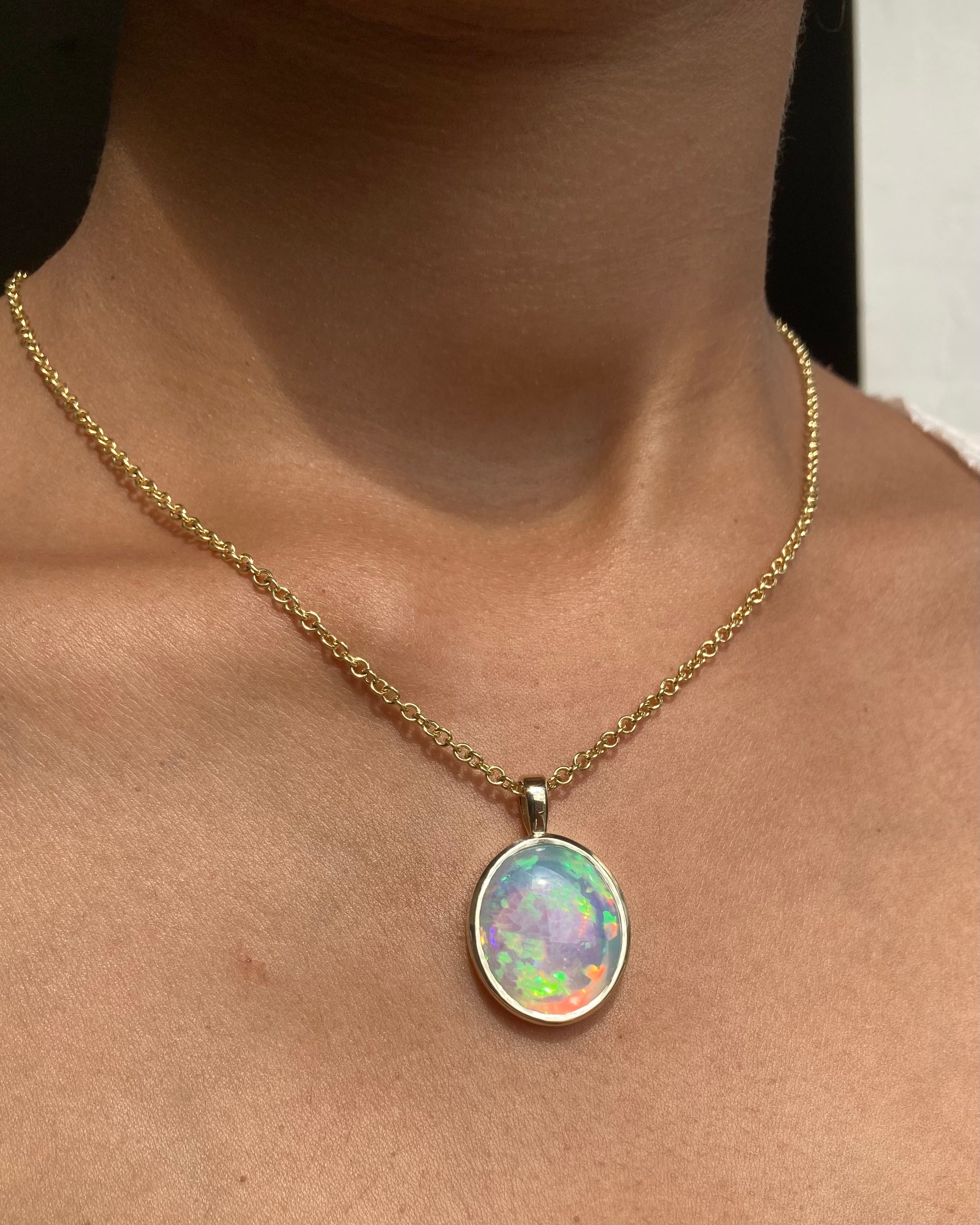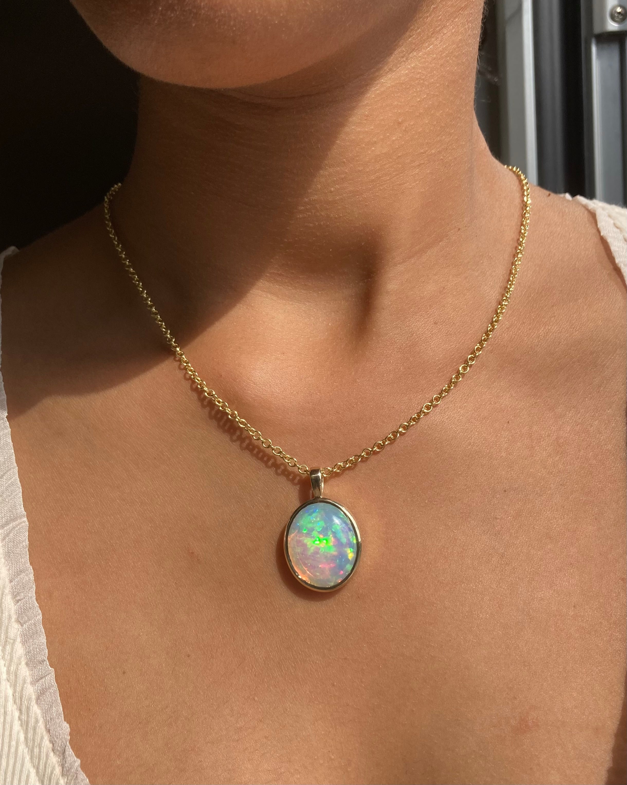 A crystal clear opal with spectacular fire. Neon shades of green and red dance across this stone. A true stunner with lots of play of color. Hand-set in our signature thick bezel, finished with a beveled edge.