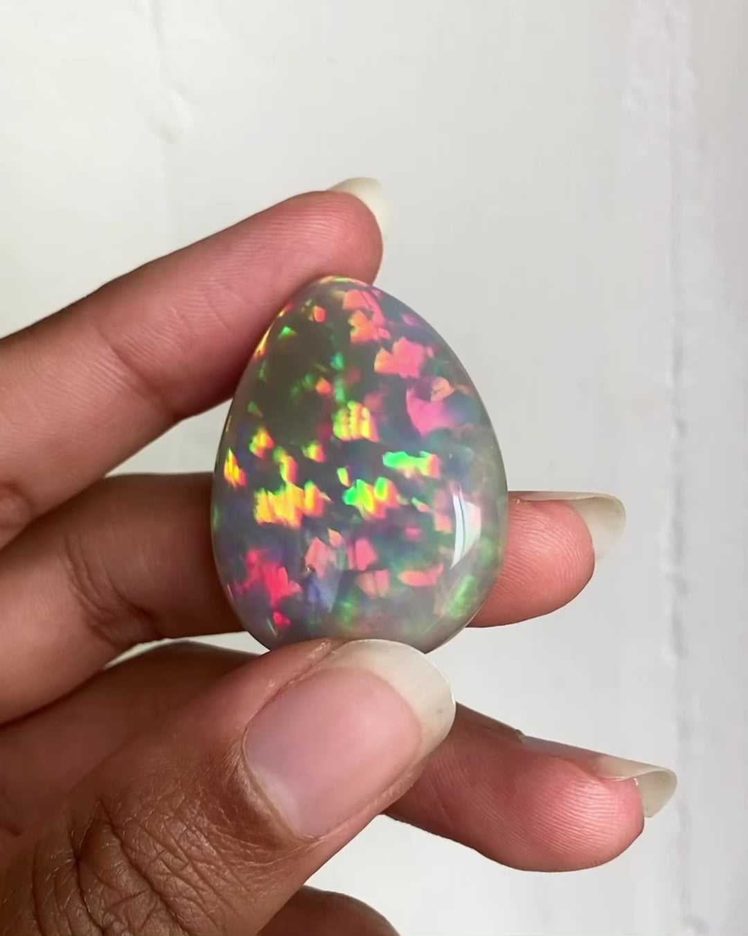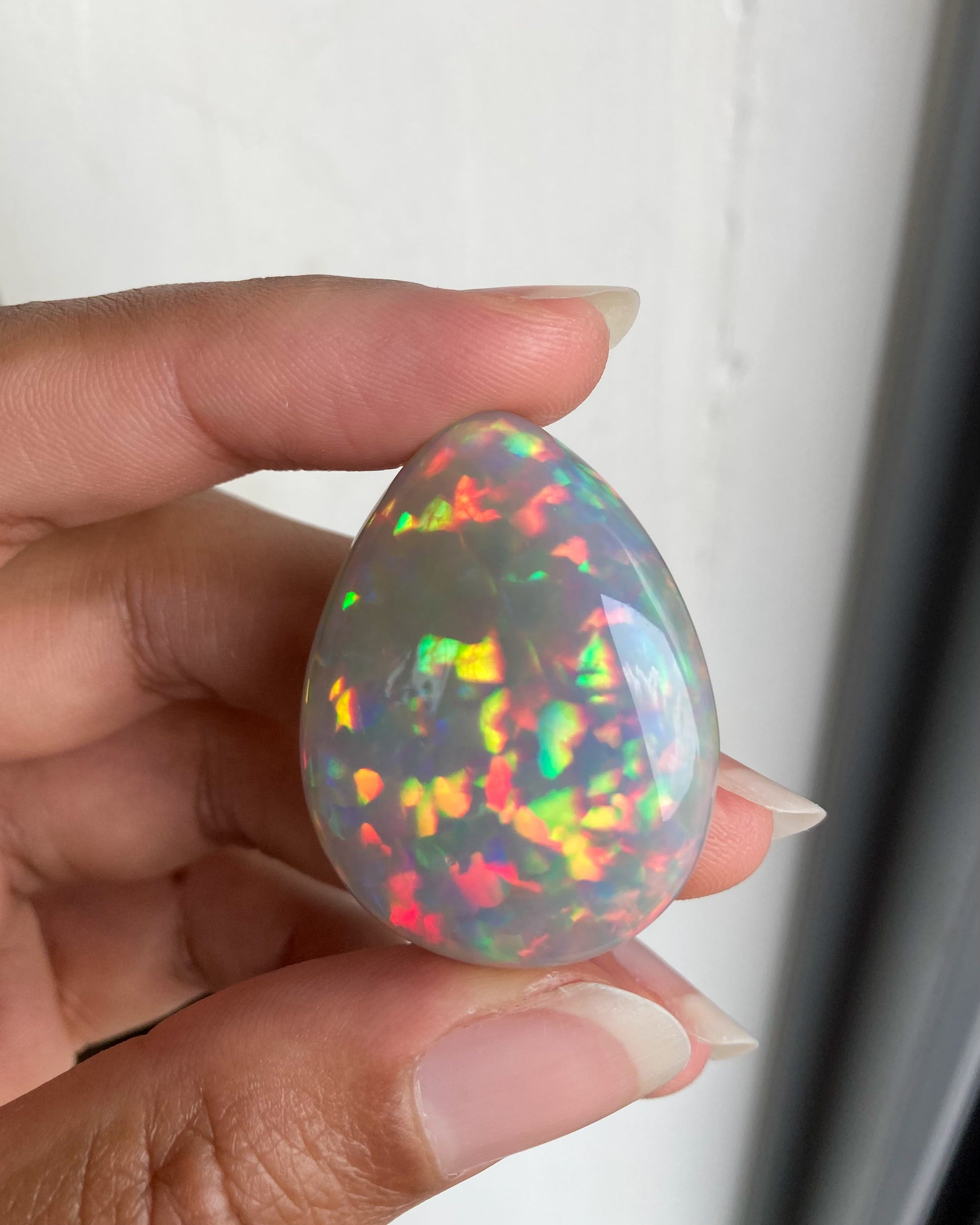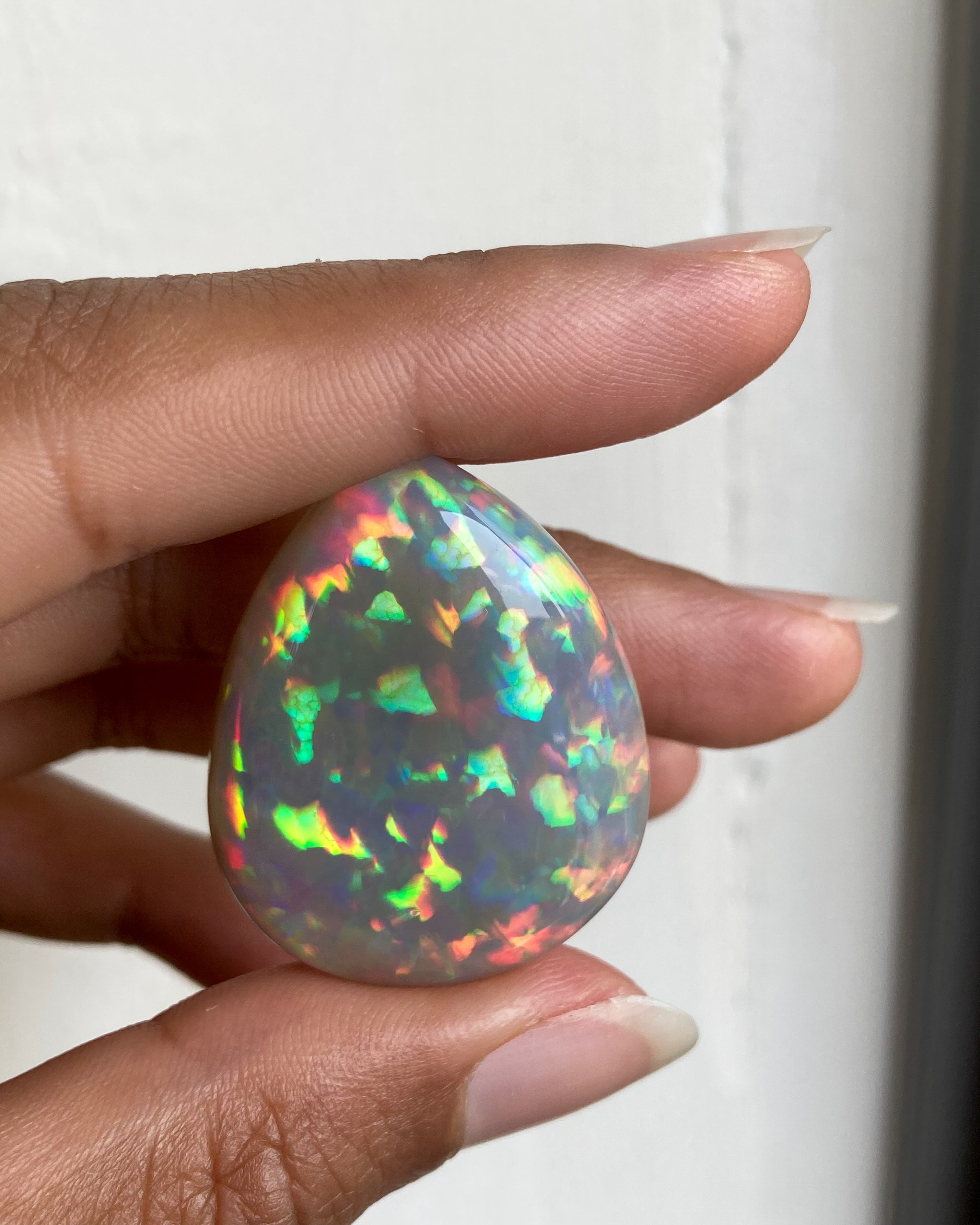 A luminous, gray opal hand-cut and polished in Ethiopia for maximum play of color. A truly striking gem in scale, presence, and fire.
